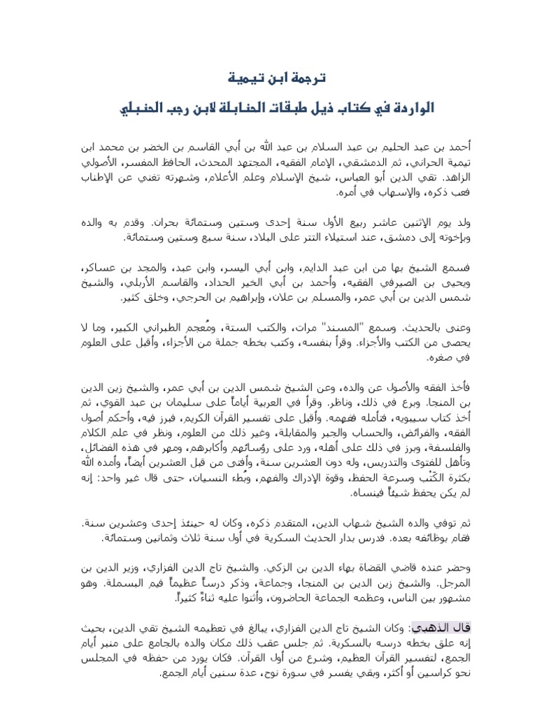 ترجمة ابن تيمية الواردة في كتاب ذيل طبقات الحنابلة لابن رجب الحنبلي