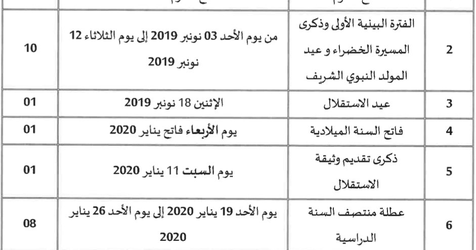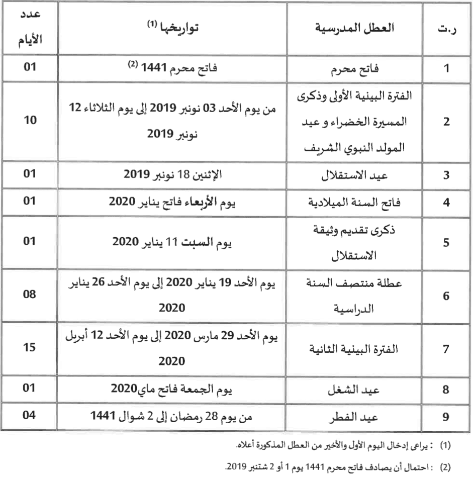 رزنامة العطــــــل المدرسية للسنة الدراسية 2019 2020 و الأعياد الدينية